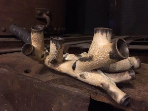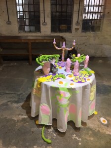 This idea comes across brilliantly in the work of Mandy Gamsu, whose garish and toy-like take on that absolute essential of everyone’s kitchen cupboard – the asparagus dish and tongs (!) (from a James Dixon & Sons catalogue of 1880) is both amusing and disturbing – as is the work of Kate Langrish-Smith whose ‘Electric Etiquette – Plastic when Wet’ based on the pestle and mortar tools of snuff-making is a more adult and highly visceral response, calling out be touched. Sarah Villeneau’s delicate and bodily ceramic listening pipes, ‘The Girl that Makes the Part’ are precariously balanced on a vast heavy industry machine, remembering the stories of the ‘Munitionettes’, women recruited for the war effort but paid less than men, and still having to deal with domestic chores while battling with explosions of molten metal on their skin and no health and safety at work.